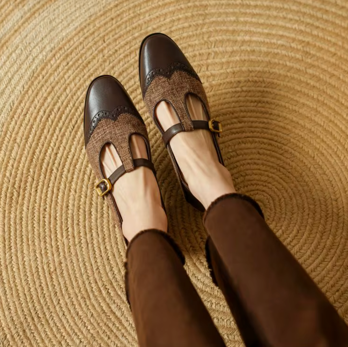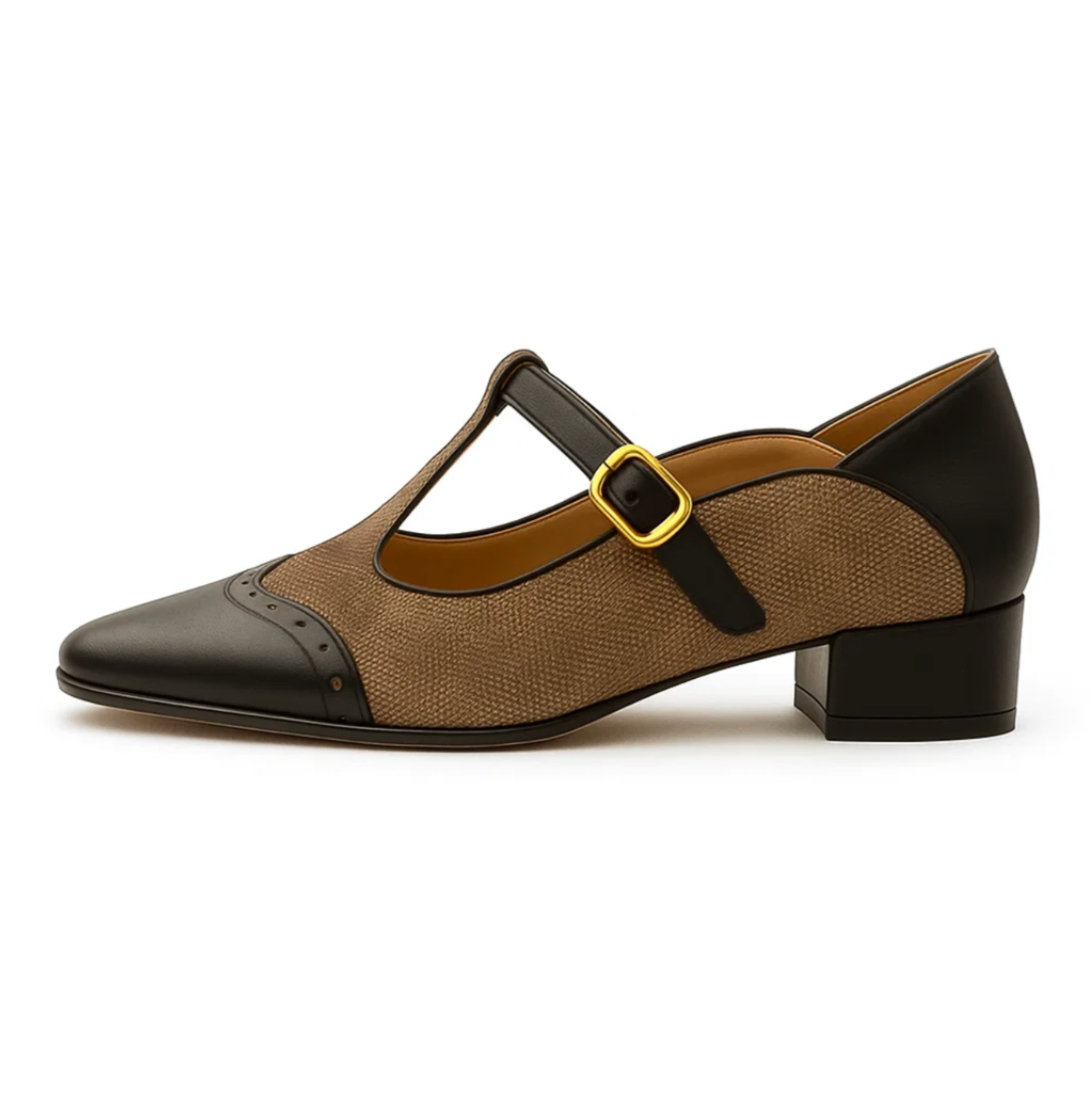 The Vintage T-Bar Pumps combine classic charm with a touch of modern refinement. The design features a stylish T-strap and a golden buckle that exudes elegance while providing extra support and comfort. The combination of high-quality leather and durable textile inserts gives the shoe a luxurious appearance, while the low block heel ensures stability and effortless wear throughout the day. Perfectly paired with both a chic office outfit and a casual everyday look, these shoes are a versatile addition to any wardrobe.