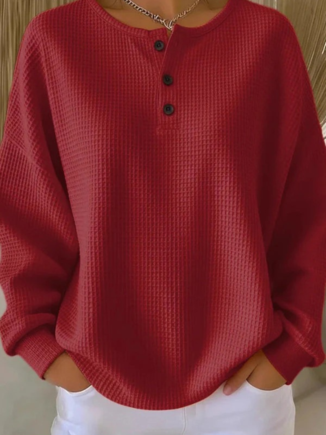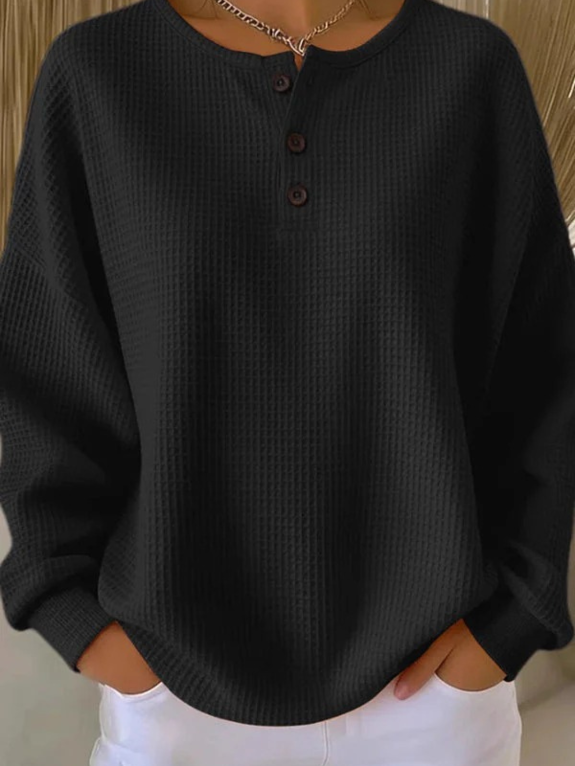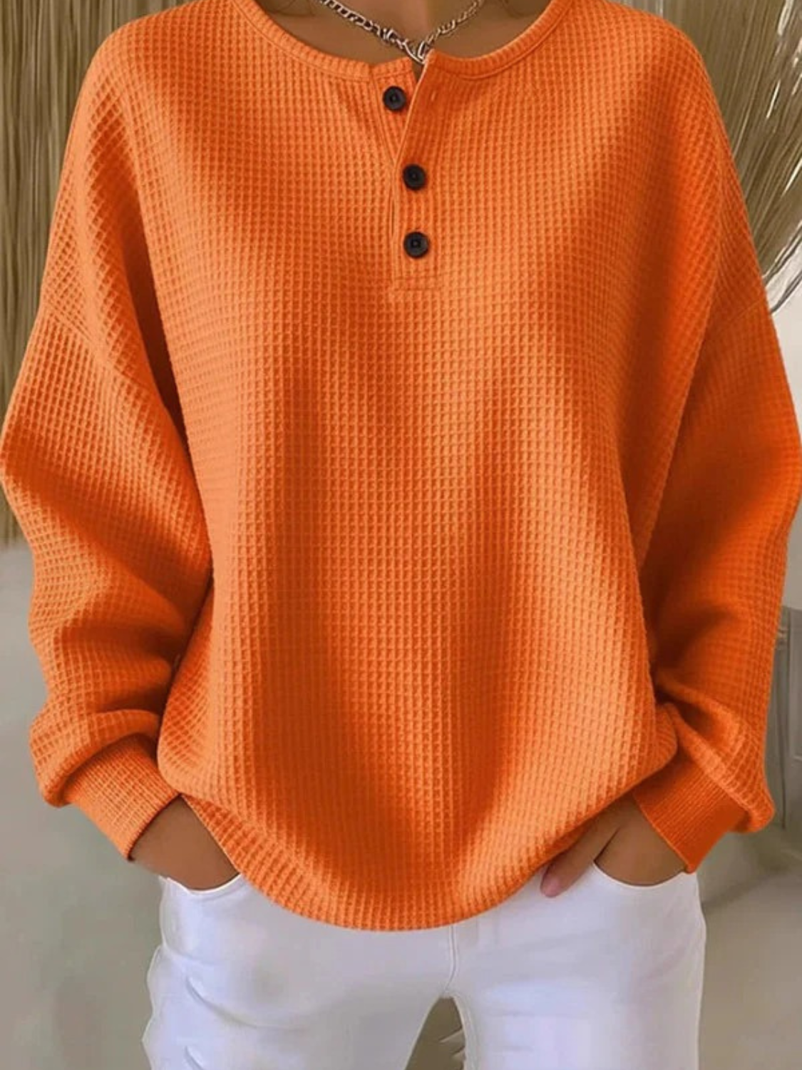 The Livia Waffle Knit Henley brings warmth and simplicity together in one timeless design. Crafted from a soft, textured waffle knit, it offers breathable comfort and a flattering relaxed fit. The three-button neckline adds a touch of structure to its laid-back look, making it the perfect everyday essential for cozy days and casual outings.