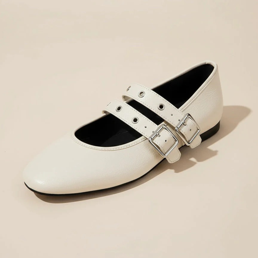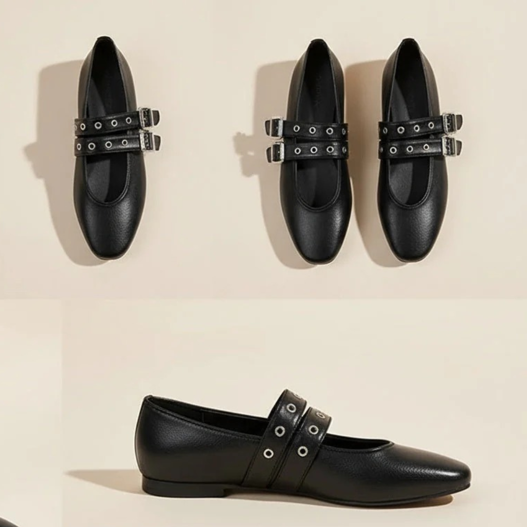 The Amelia flats feature a sleek almond toe and a soft, structured finish with two delicate silver buckles — adding a modern twist to a timeless classic.